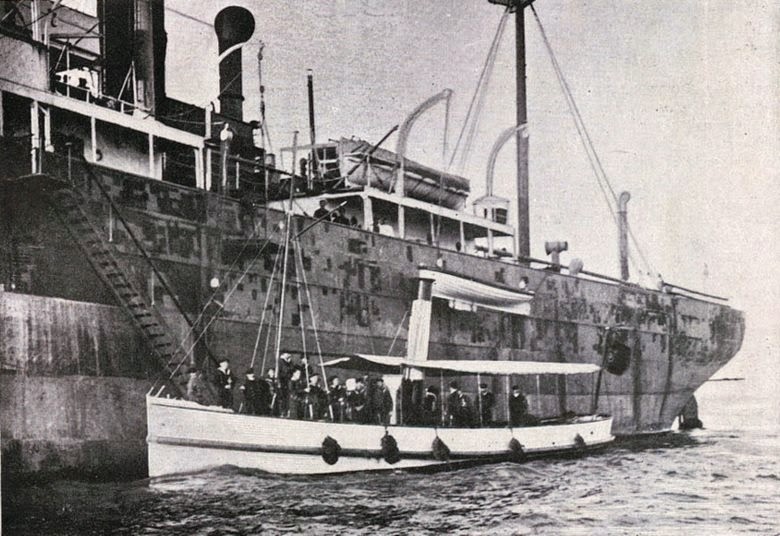 O vapor “Cisne”, junto de um vapor alemão, conduzindo as forças da marinha que tomaram posse dos navios alemães, Março de 1916